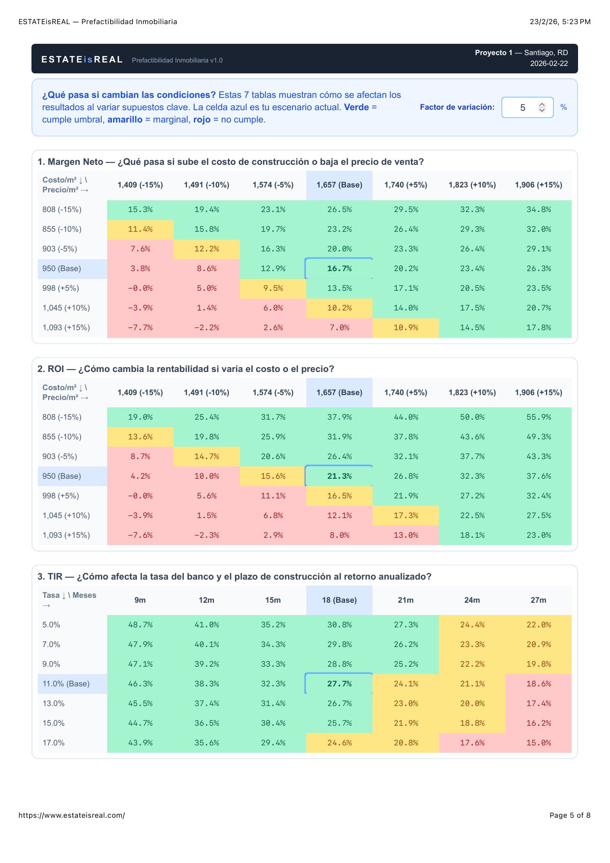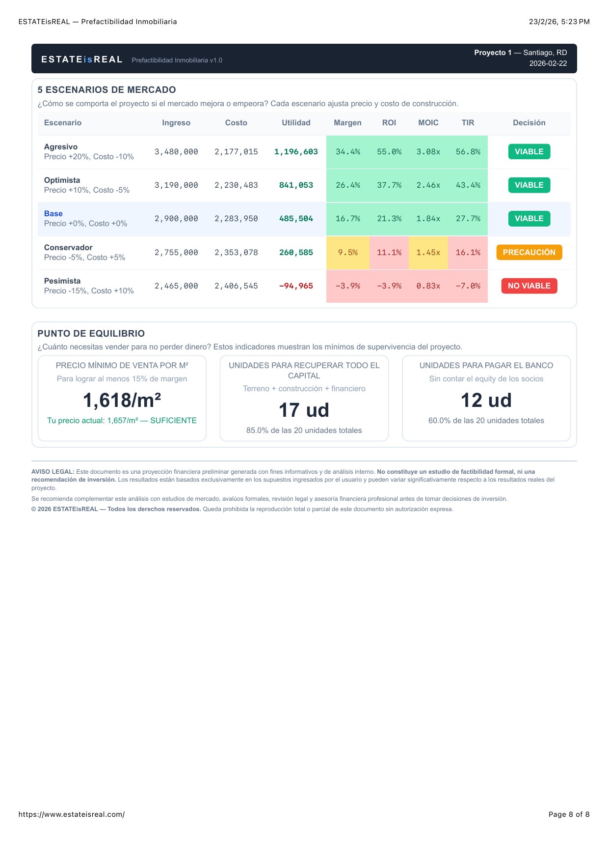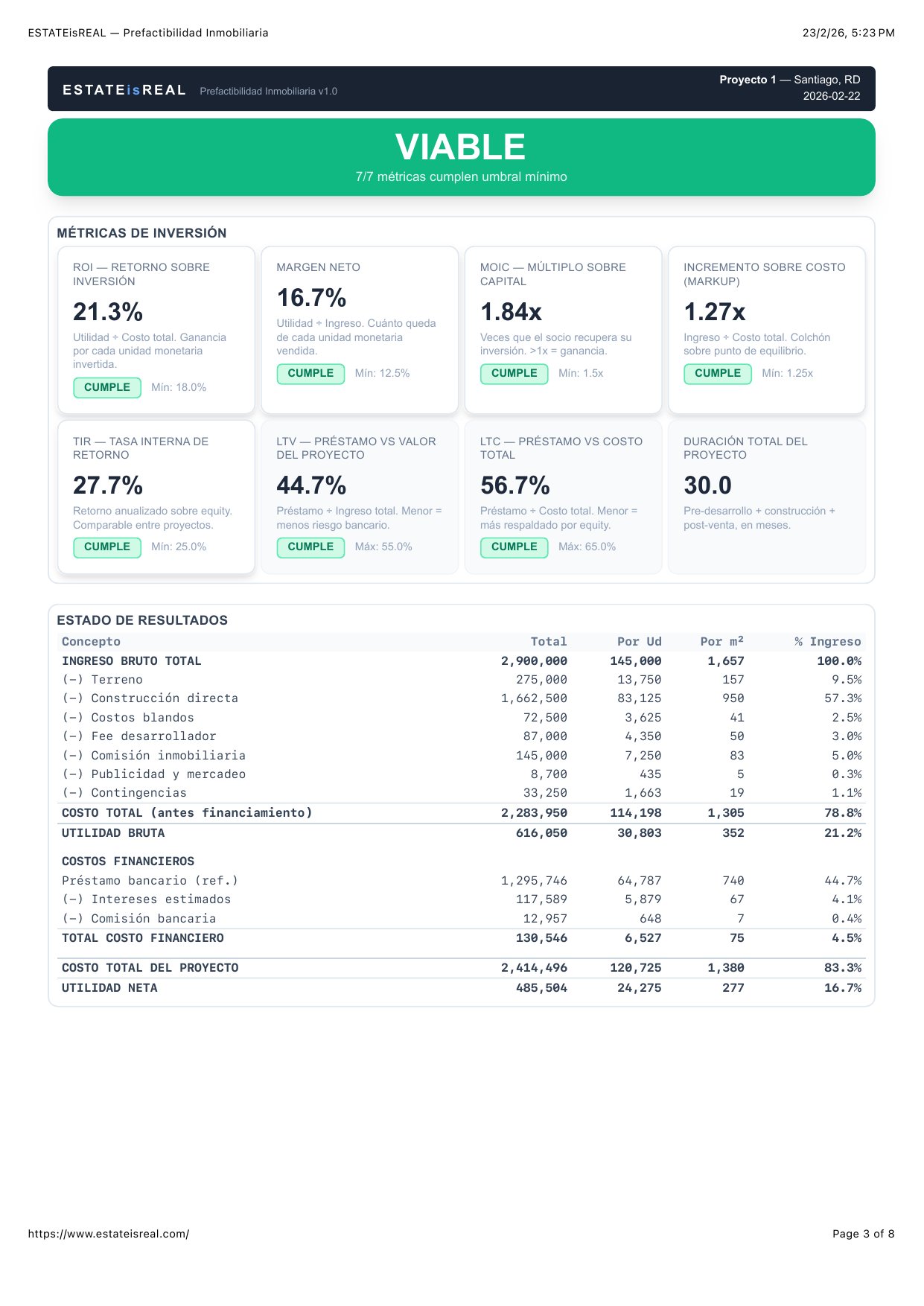 Así luce un análisis completo generado por ESTATEisREAL. Métricas, tablas de costos, sensibilidad y más — todo en un reporte profesional.